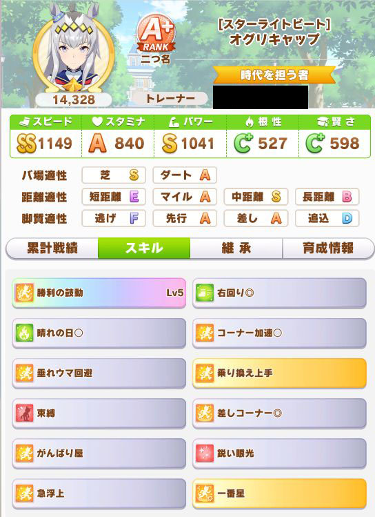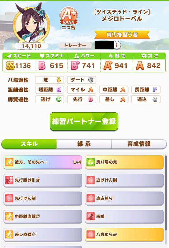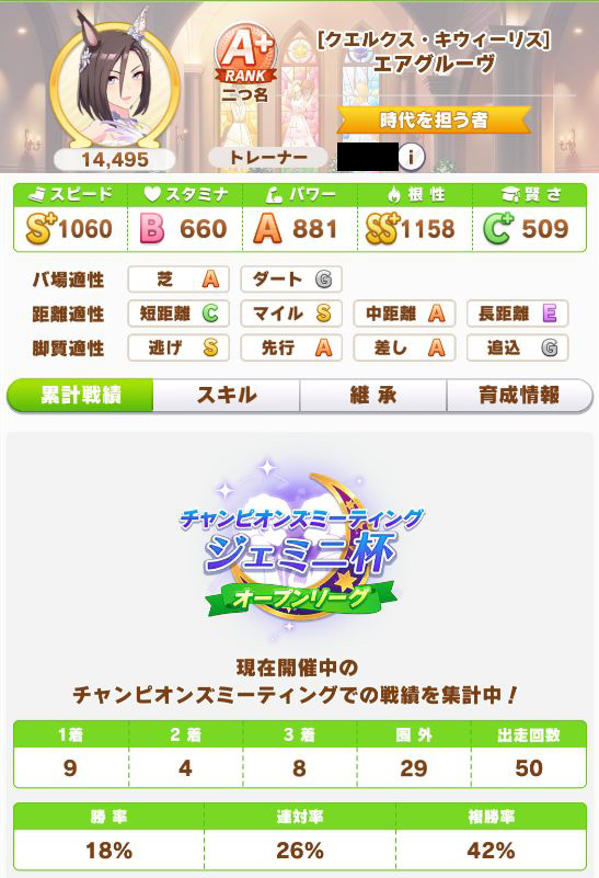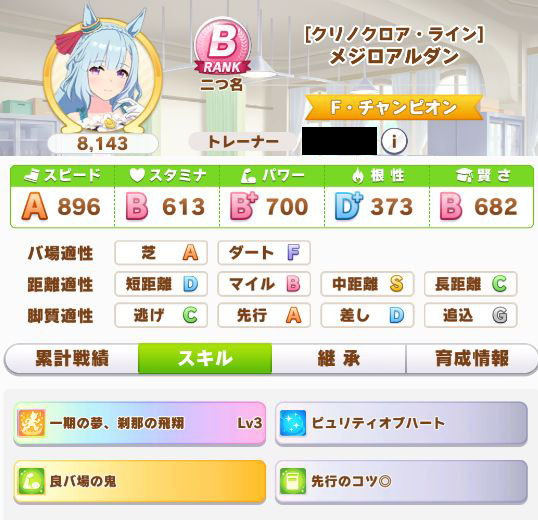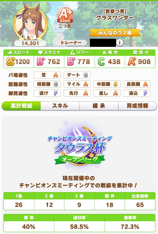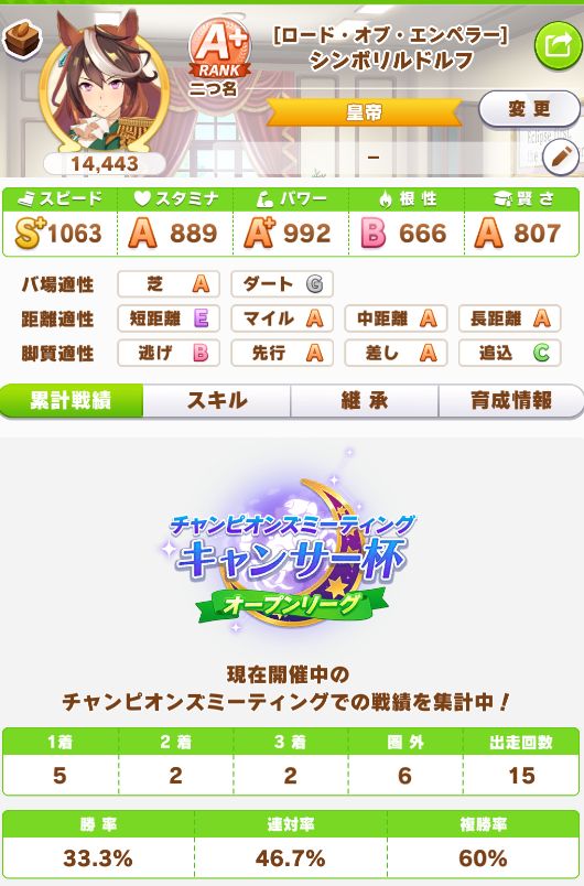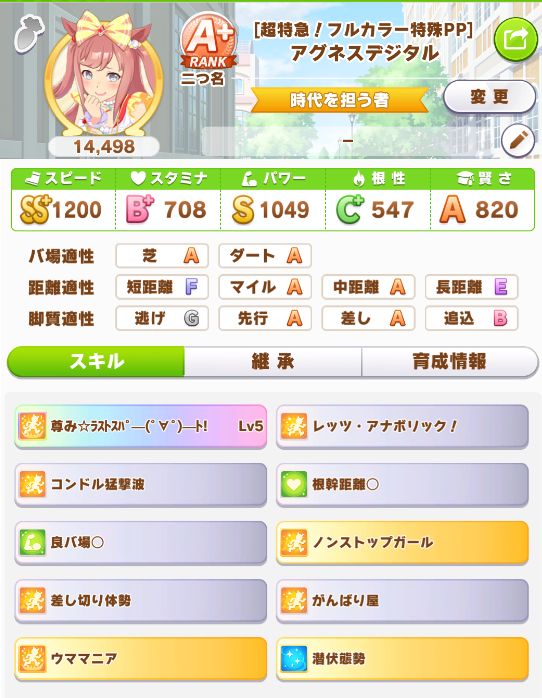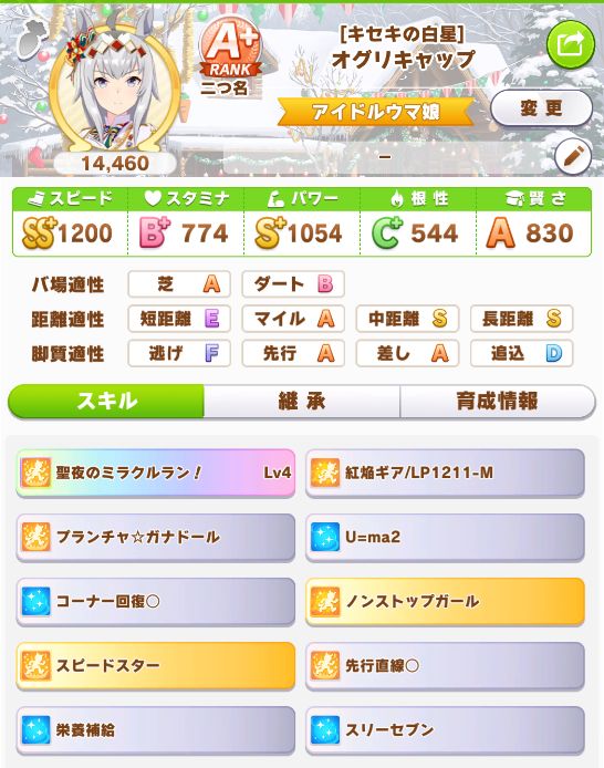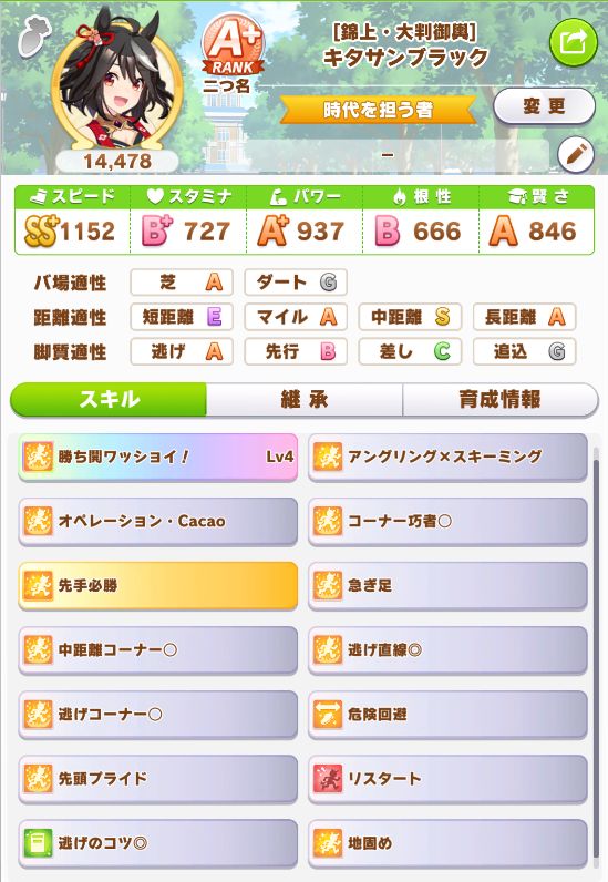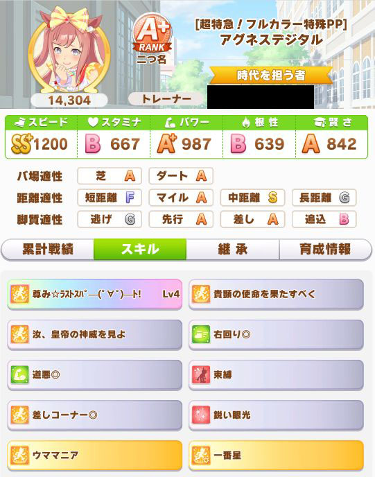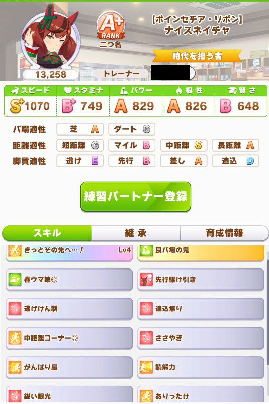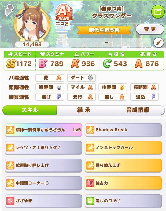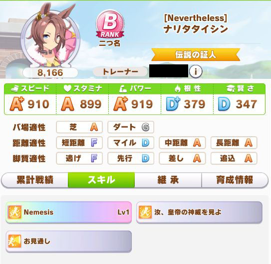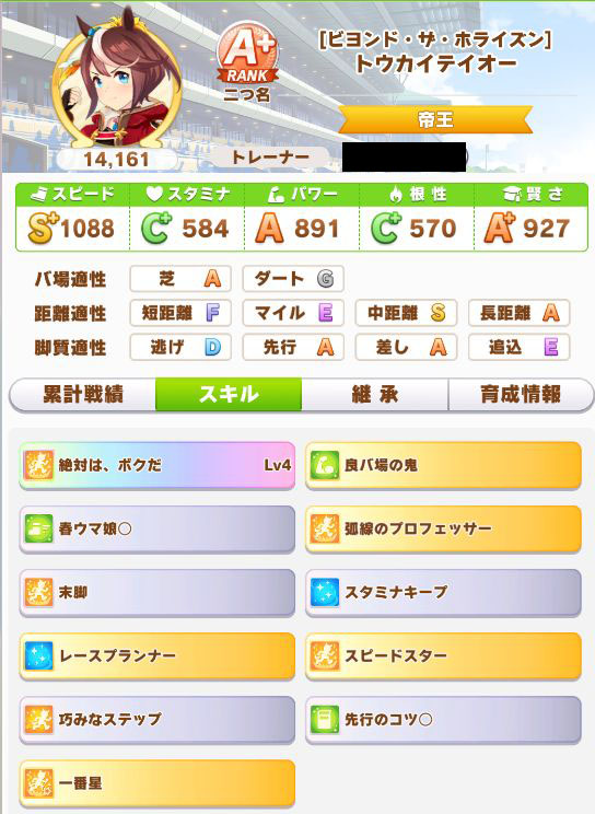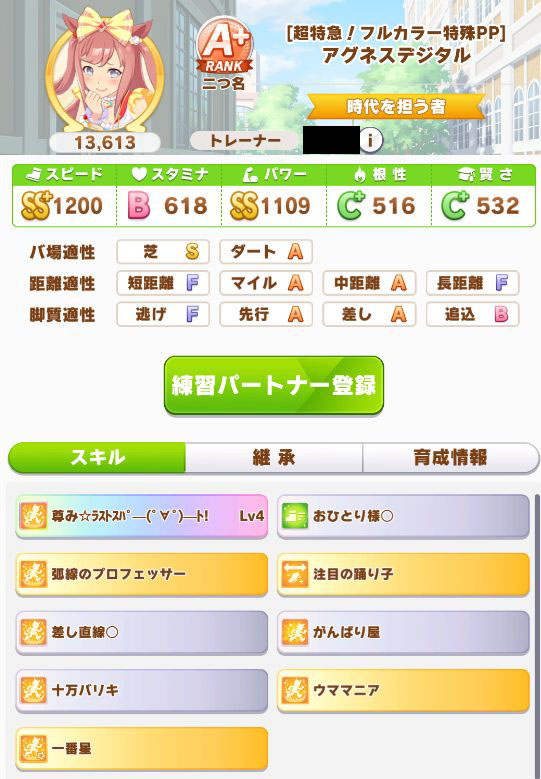 緑スキルを入れずに育成した、汎用性を重視したステータスだったので