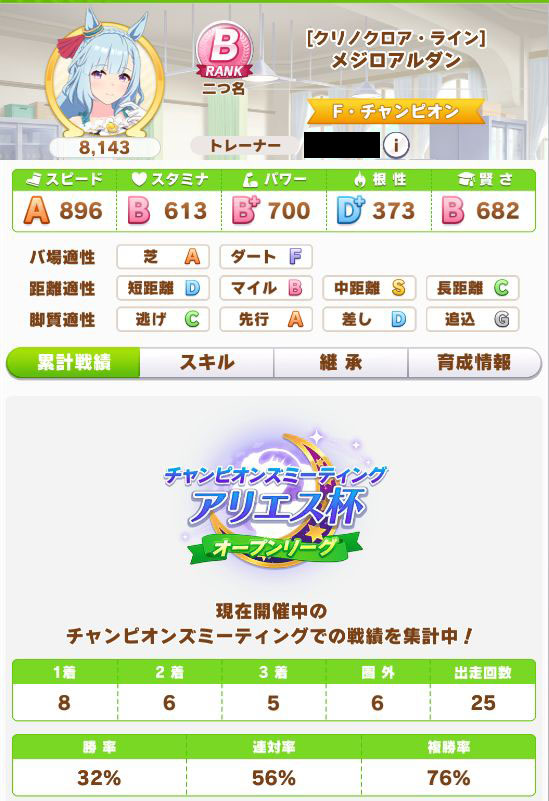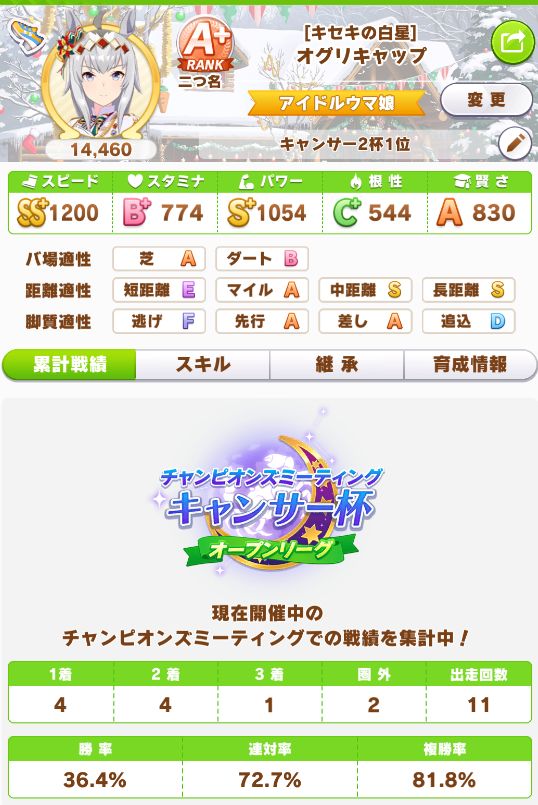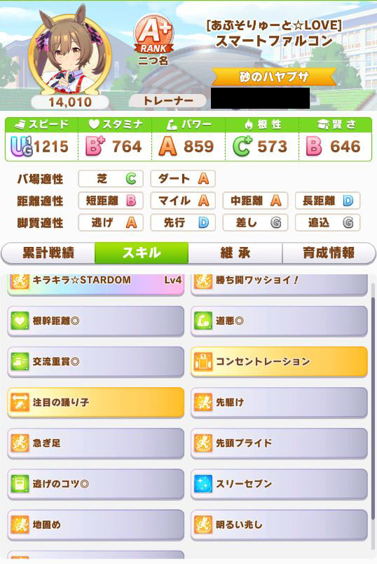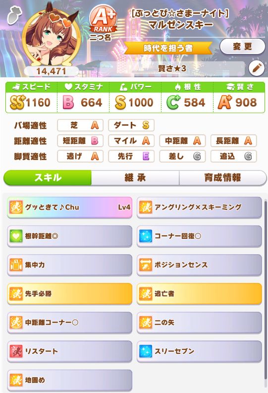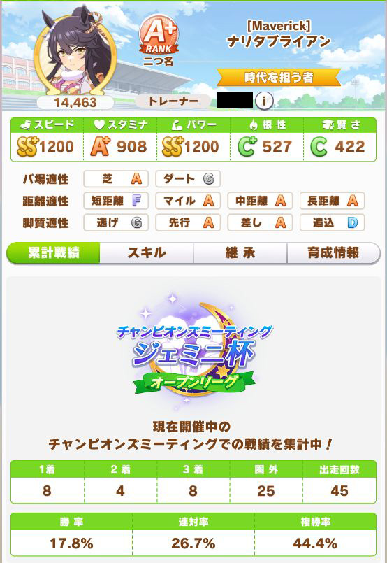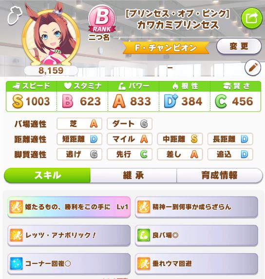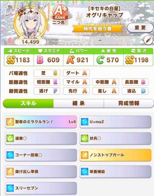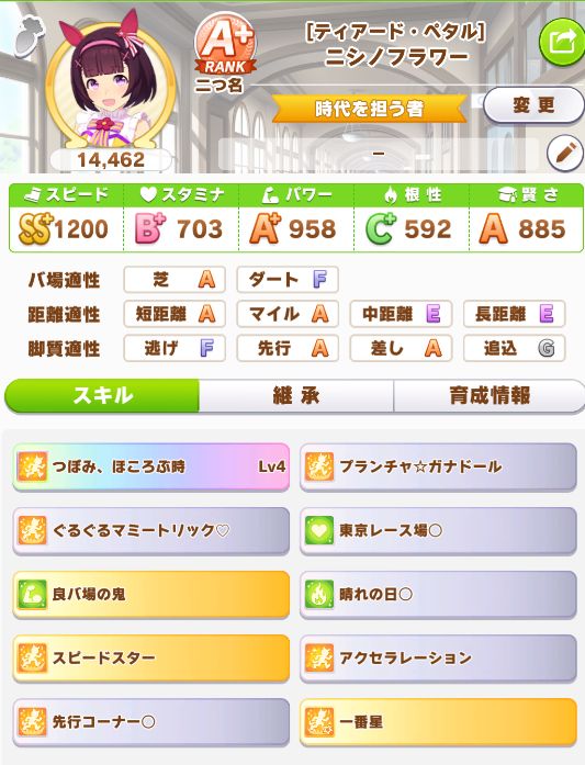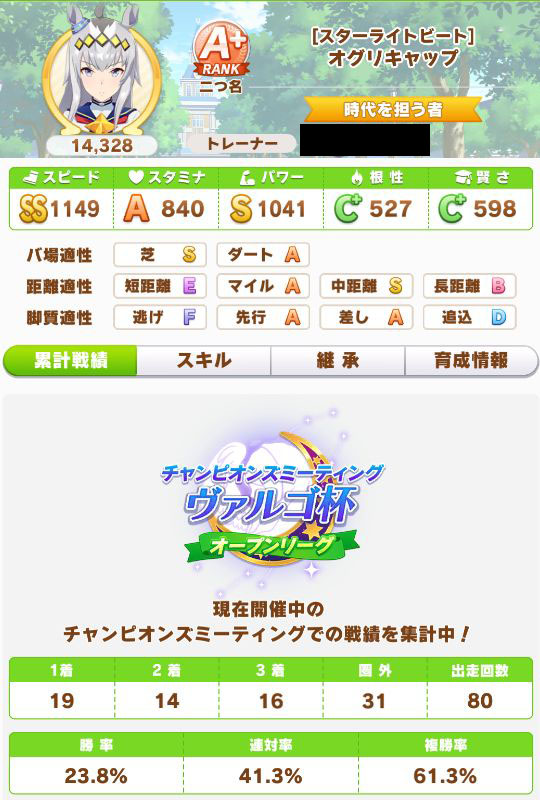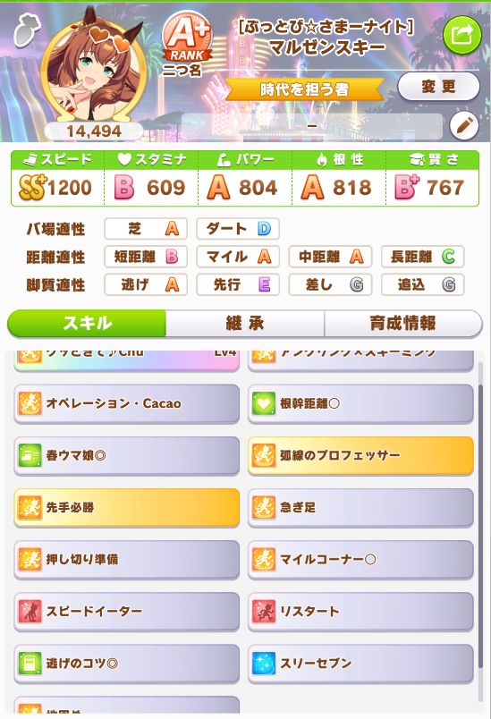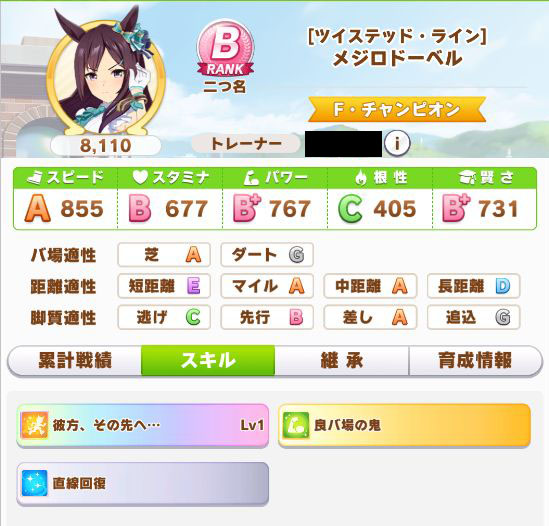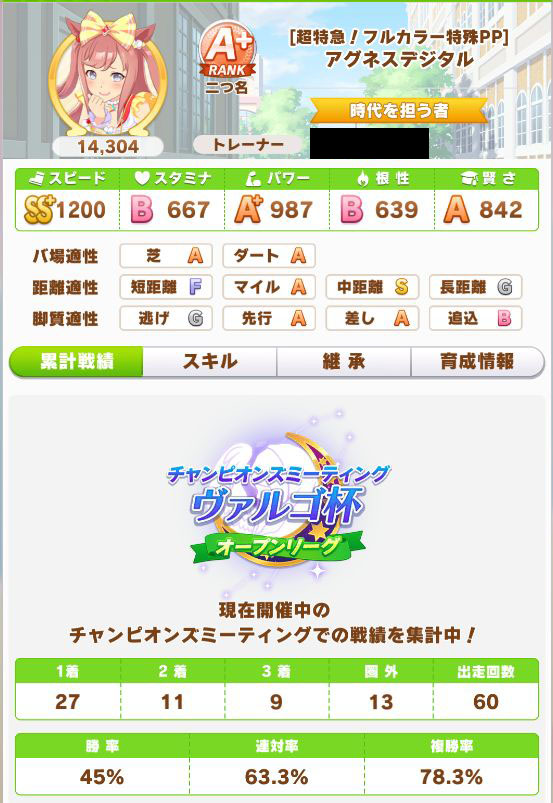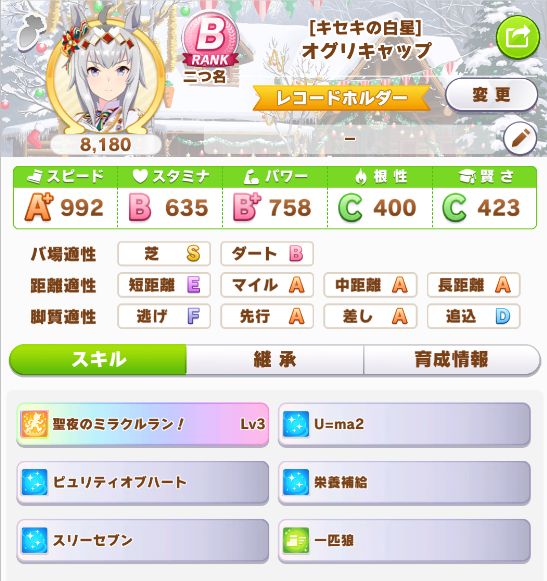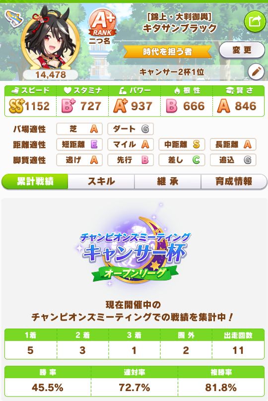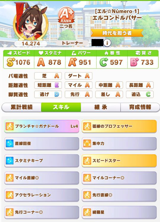 緑スキルを入れずに育成した、汎用性を重視したステータスだったので