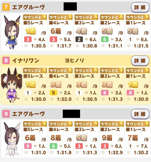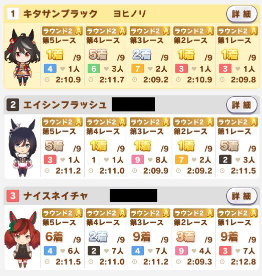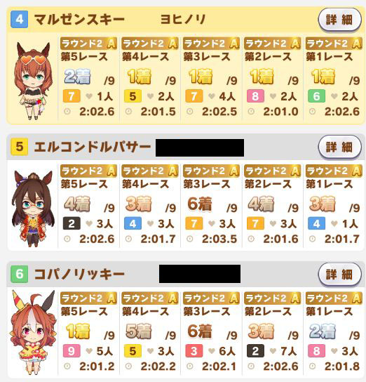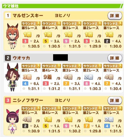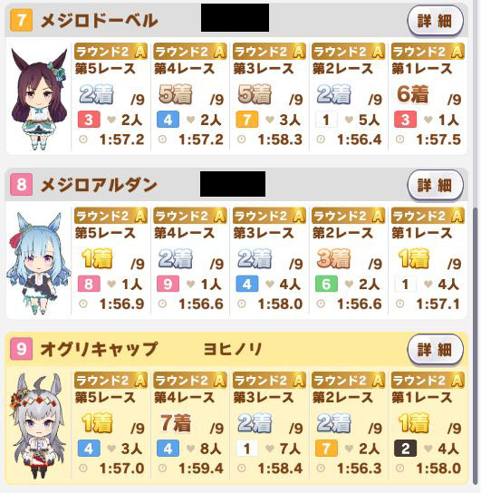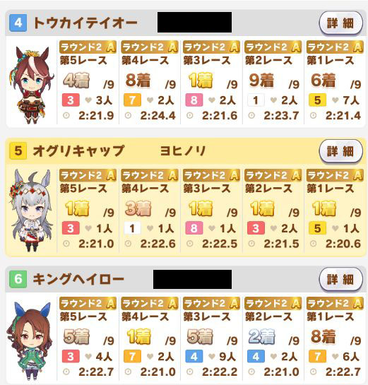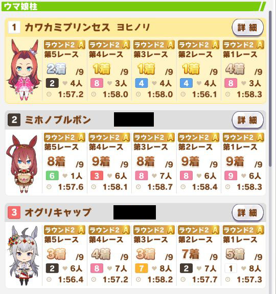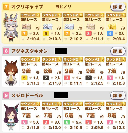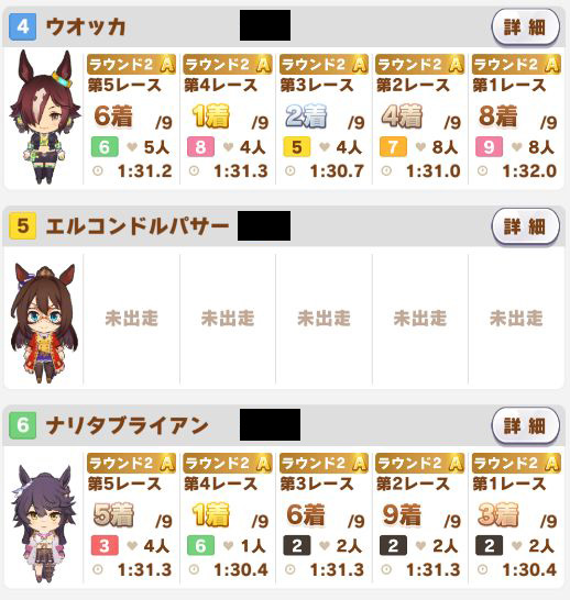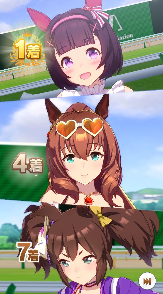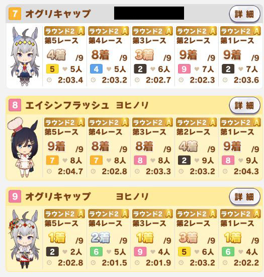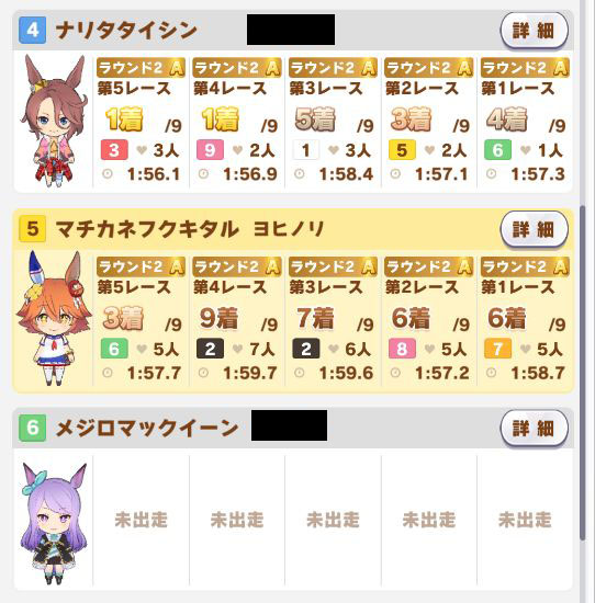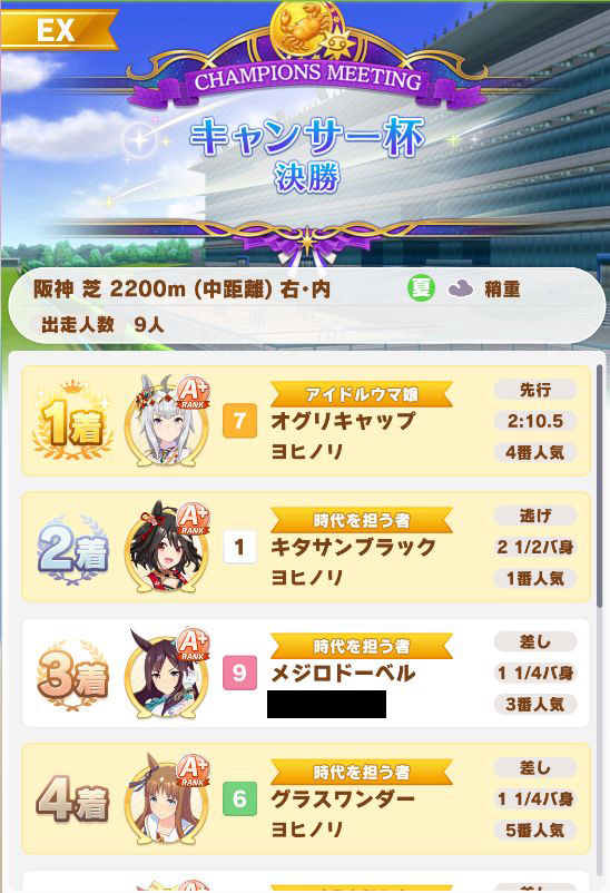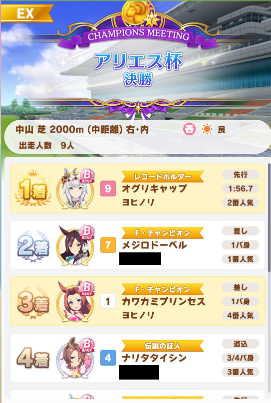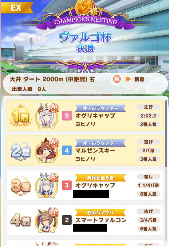以下カワカミ、タイシン、アルダン、マック、相手のクリスマスオグリ、フク、チョコボンという結果に。