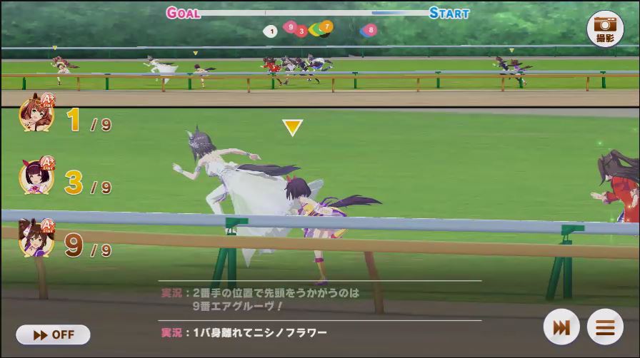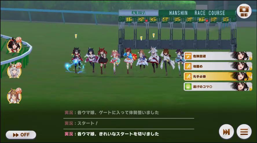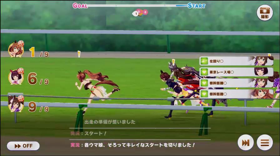 出走したウマ娘は、逃げ2(チョコブルボン、マック)先行3(クリスマスオグリ2人、アルダン)差し3(カワカミ、フクキタル、ドーベル)追込1(タイシン)と