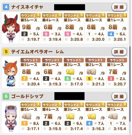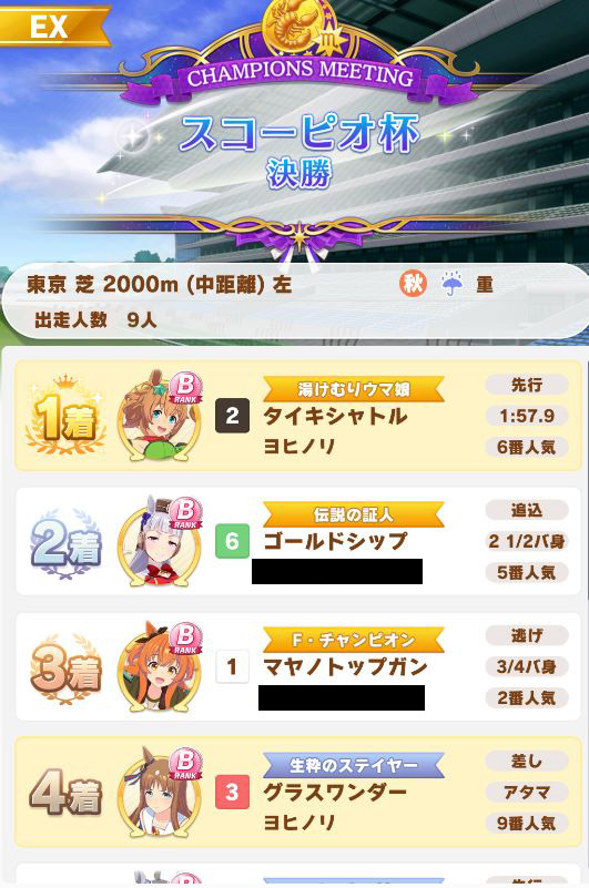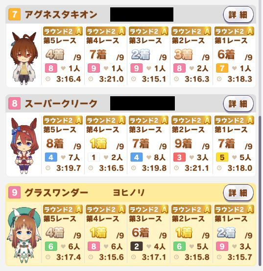 以下マチタン、ヒーラーグラス、相手のゴルシ、フク、ゴルシ、ネイチャ、クリーク、オペラオーという結果に。