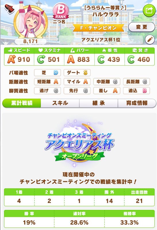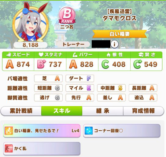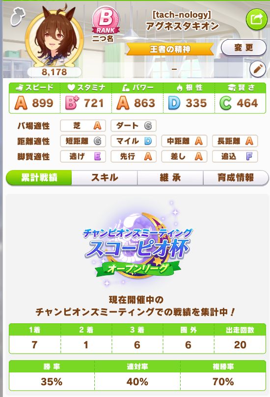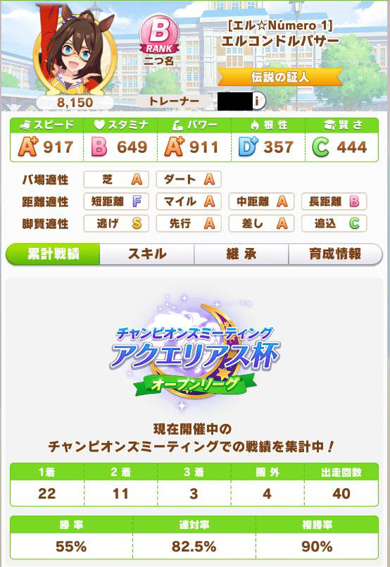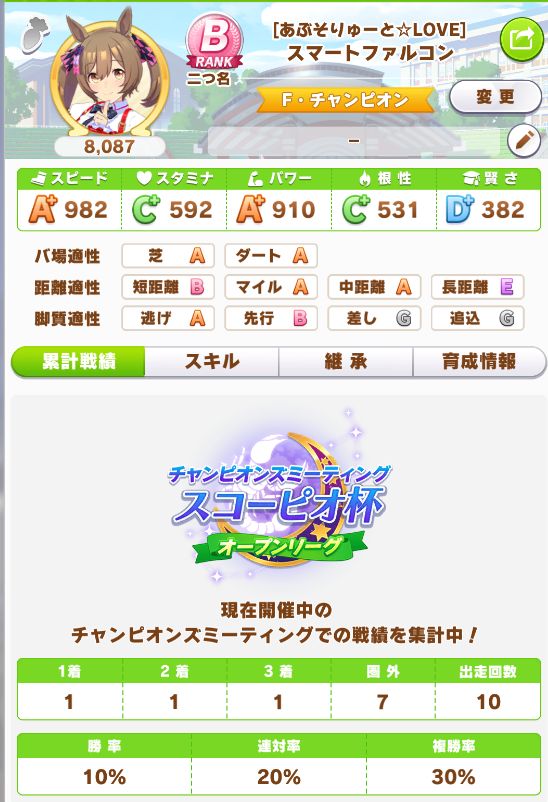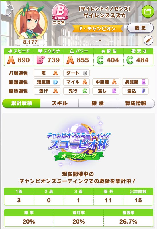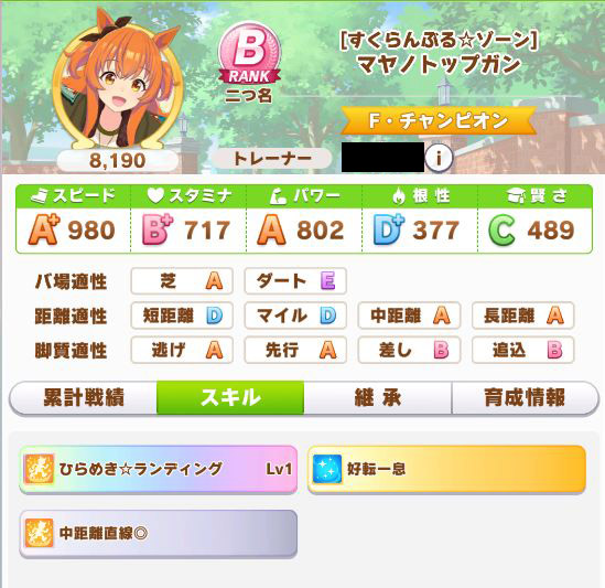スコーピオ杯で育成し、スキルは悪くなかったものの