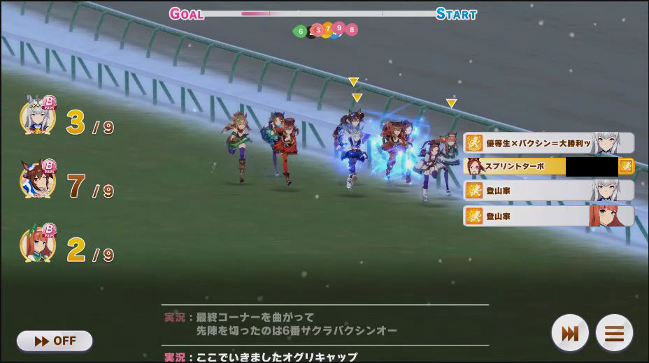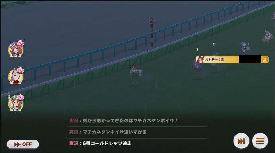 レース中盤。この時点でファル子の固有が出ず、ファル子の蓋は失敗。