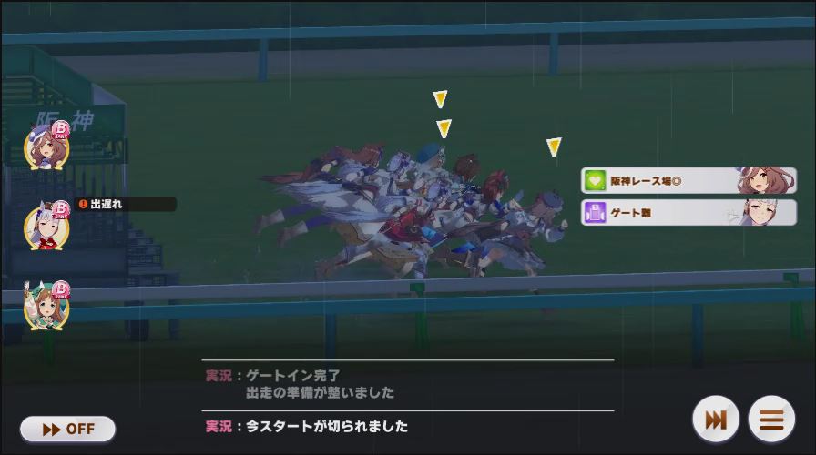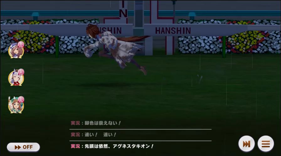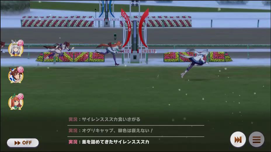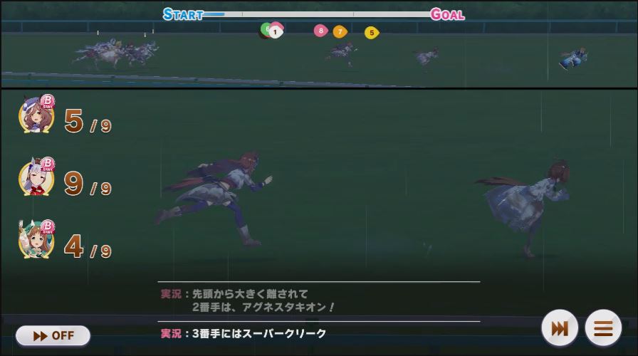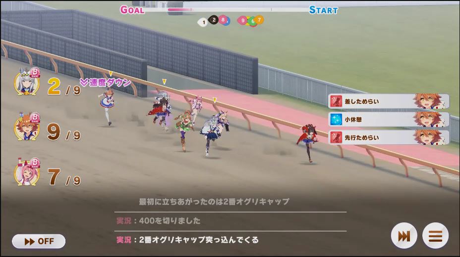 逃げ1人(エル)先行4人(オグリ、エル、タイキ、和服シチー)差し3人(ウララ、フク、オグリ)追い込み1人(ウララ)