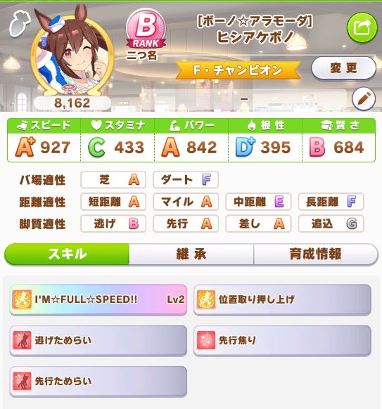 当初は逃げ脚質で地固めコンボを使った娘を起用したかったのですが、どうにも納得行く育成が出来ず