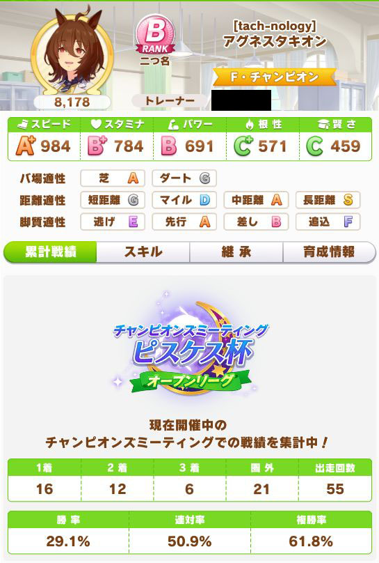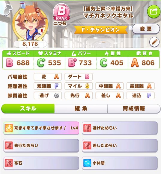 ファル子は今回起用した以前に育成した、ステータスが上振れ過ぎた娘ながら