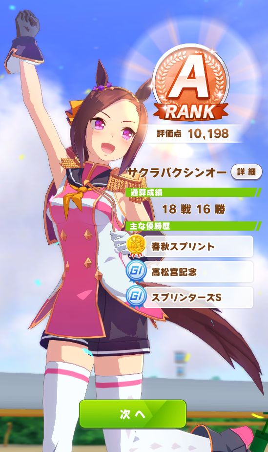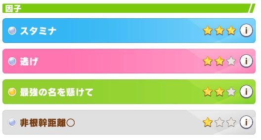 育成始めてから、ジュニアカップ対策(マイル因子上げる)を忘れてることに気づいたが、レースの方は無事勝利。