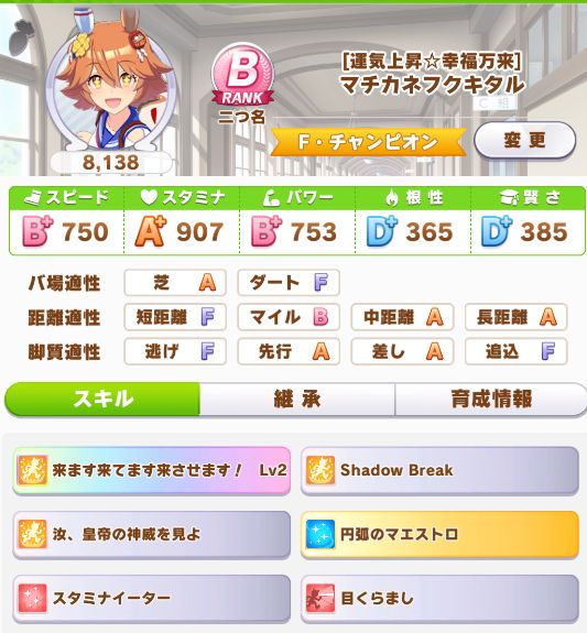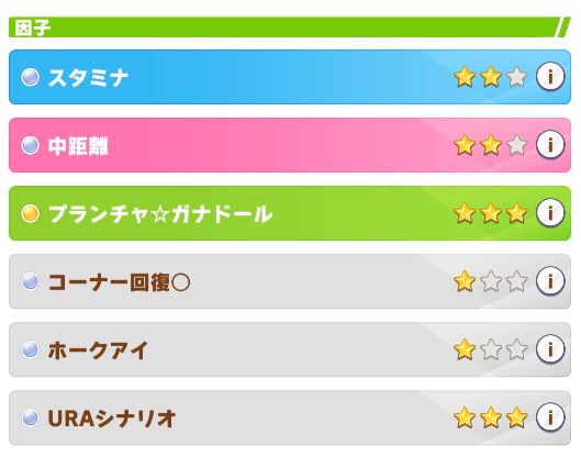 因子は、またも青☆3で芝因子も合計6とだいぶ良い感じ。