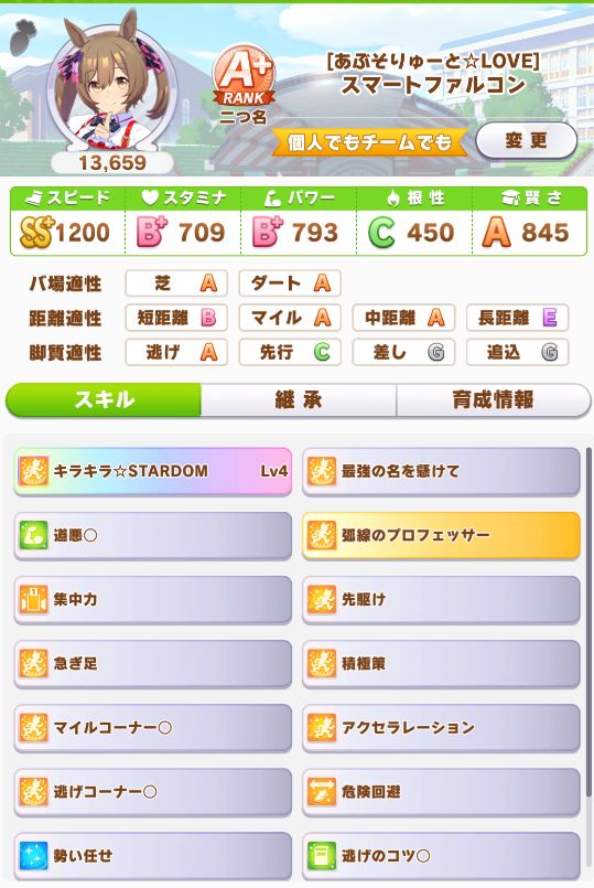 金スキルは少なかったものの、白スキルを多めに取れるだけのスキルポイントを獲得出来たおかげでファル子の自己ベスト更新。