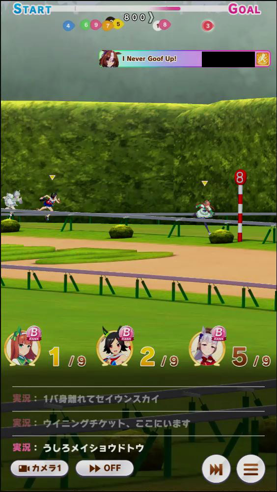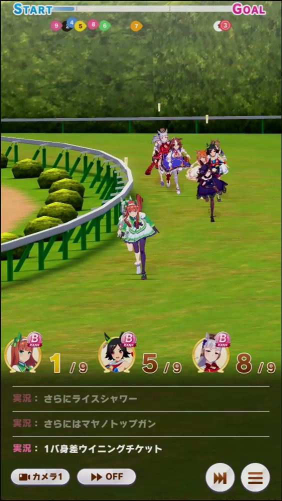 今回の脚質は逃げ2(スズカ、セイちゃん)先行2(ライス、花嫁マヤちゃん)差し3(チケゾー、ドトウ、グラス)追込2(ゴルシ、タイシン)