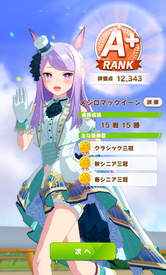 序盤でだいぶ躓いて、レースに多めに出す形に変更した為ステータスは下振れ