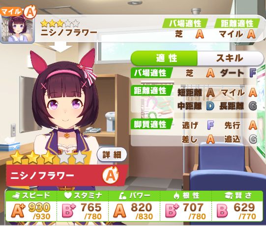 初育成で無敗とはやりますねぇ!中距離よりはマイル向きなステータスですが。