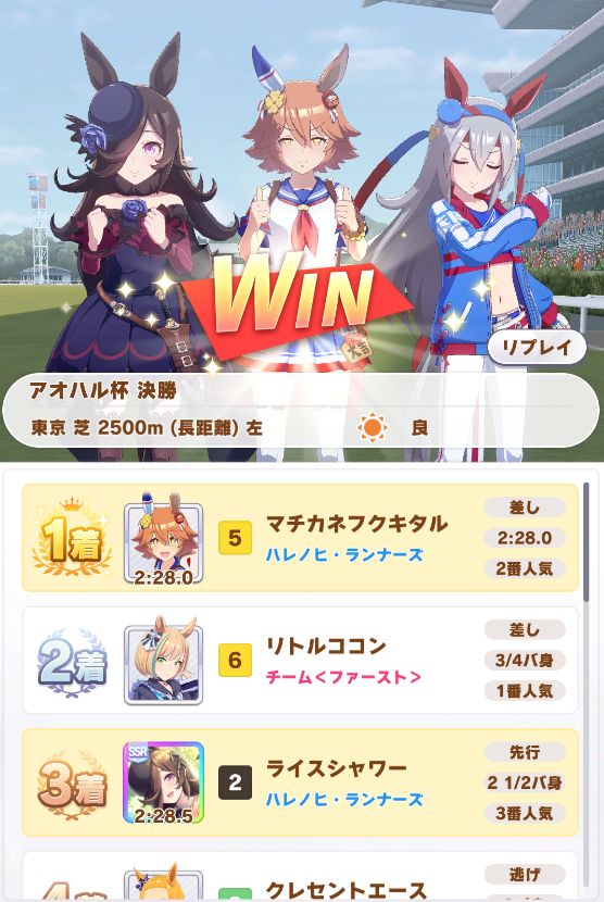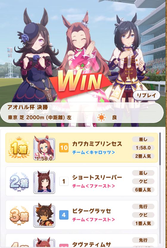 アオハル杯決勝はビターの抜け出しが遅かったこともあって、固有スキルでギリ勝利からの優勝(画像撮り忘れ。なお3勝)
