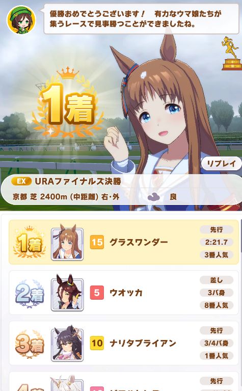 URAは決勝戦でハッピーミークに終始前を塞がれ、最終直線だけで全員を追い抜いての優勝