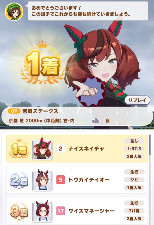 レースも京都ジュニアから差し脚質にして、序盤にチケゾーから差しスキルを貰ったおかげで勝利し、その勢いでホープフルも勝利。