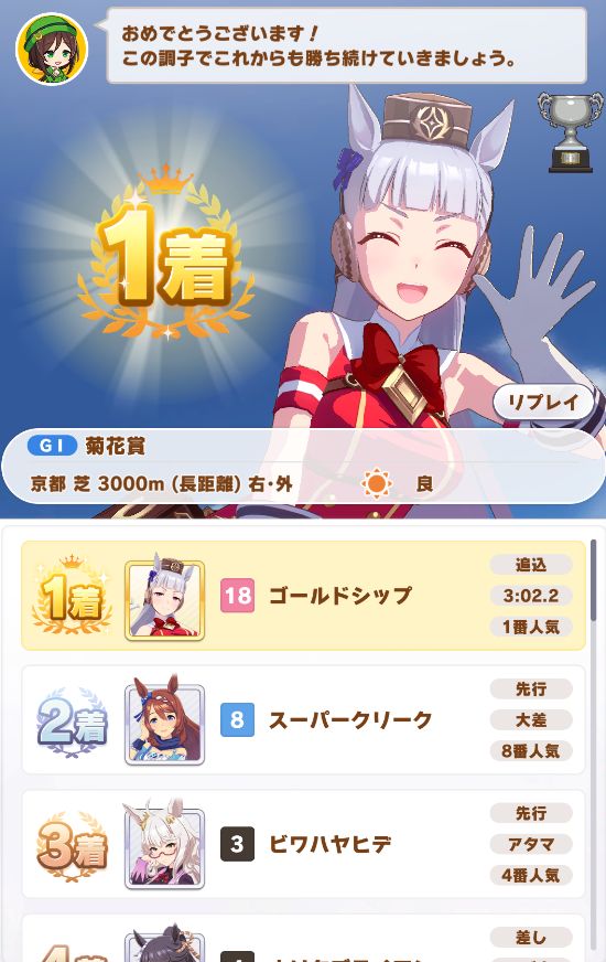 菊花賞は外枠、固有スキル無しで大差勝ち。
