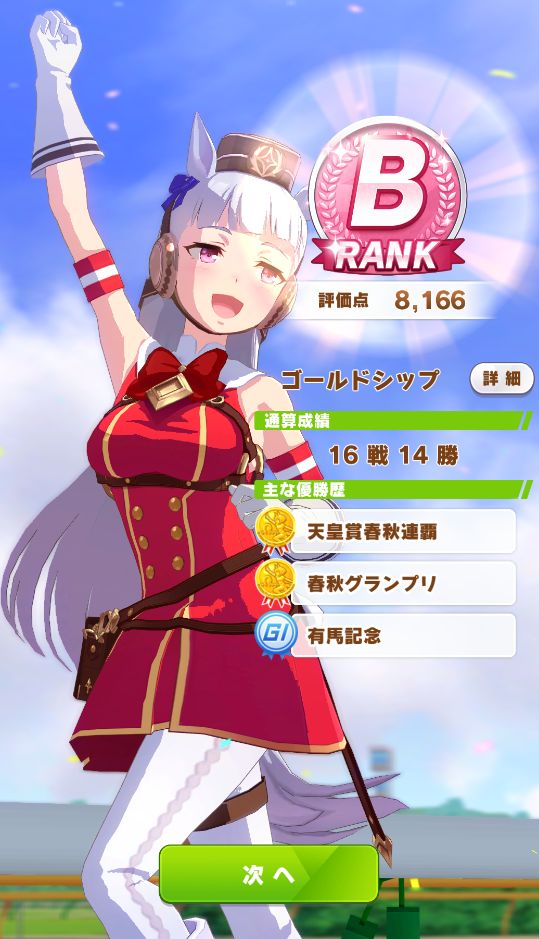 この時点でスタミナが700を超えだして、そろそろステータスを抑えて育成しないとマズイ状態だったので、極端な上振れせず助かった。