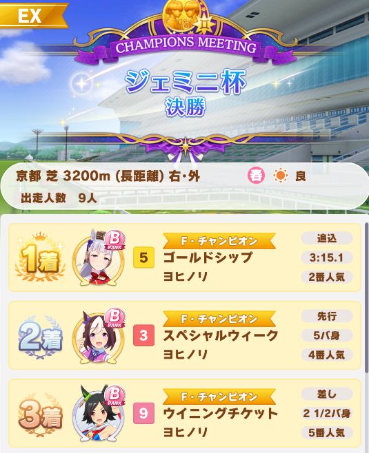 スペちゃんはマエストロ、チケゾーは好転一息が出ずスタミナ量がゴルシに追いつかず