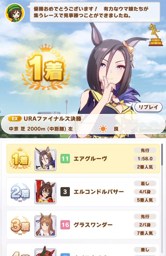 大阪杯、最内枠出遅れも7バ身、春秋マイル目当てで安田記念を出るか考えたが、ちょうどスピードトレーニングがダブルで虹だったので回避して宝塚。最内枠で、あわやモブロックされる展開だったがスピードスターが役に立ち3バ身勝利。