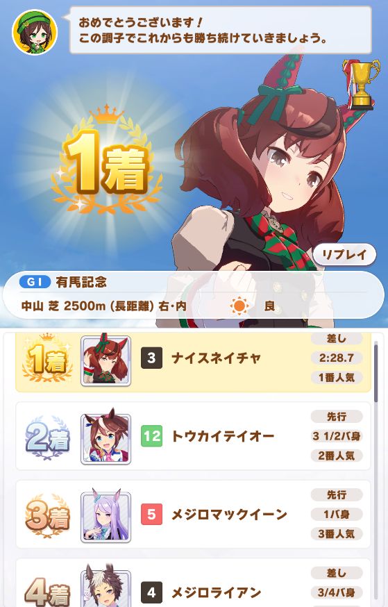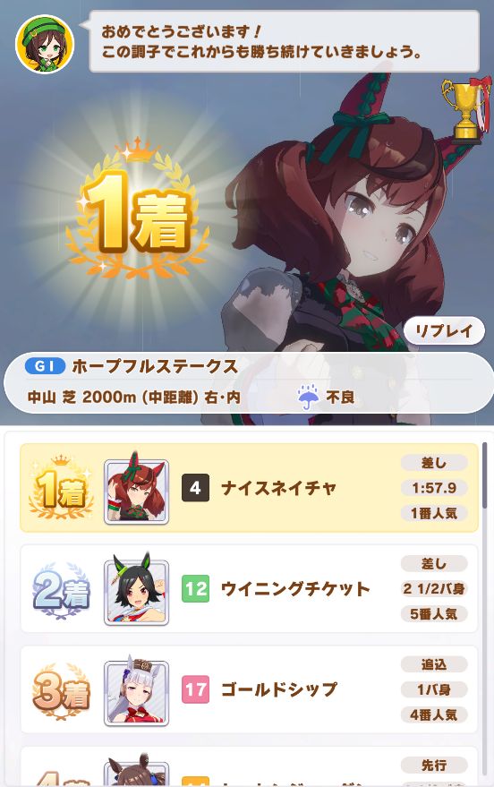 シニア級、福引はにんじん山盛り。大阪杯は内枠なので先行にしたら掛かって道中、向こう正面で謎の急減速でバ群に包まれ、スーパークリークを抜くのに手間取り4着。