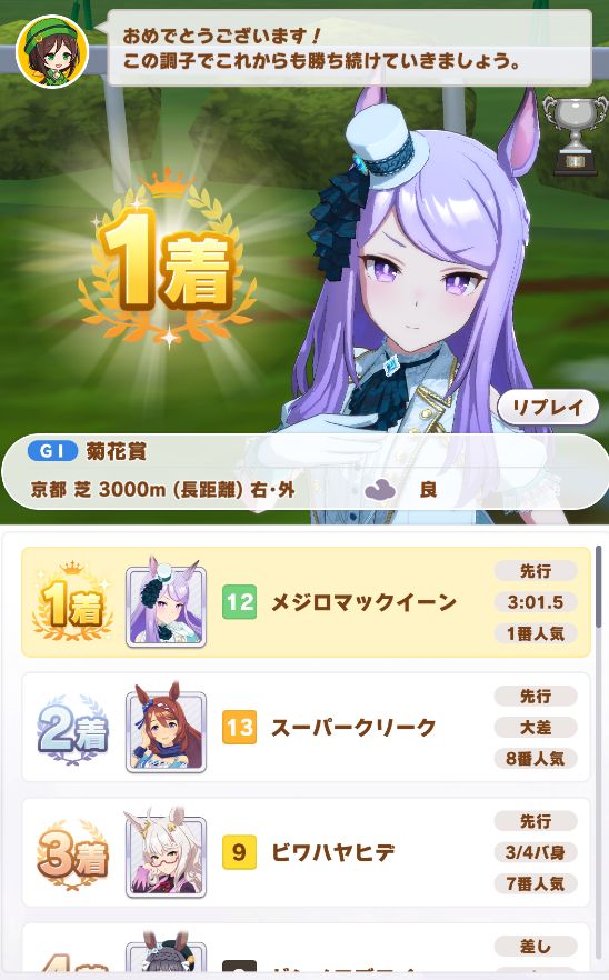 シニア級2月にマエストロ、9月にプロフェッサーのヒントを獲得し、今回は無事完走。