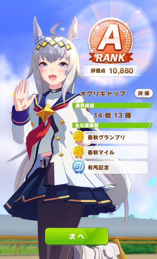 差し脚質らしいスキルは獲れたものの、ステータスはもうちょい上振れたかった。