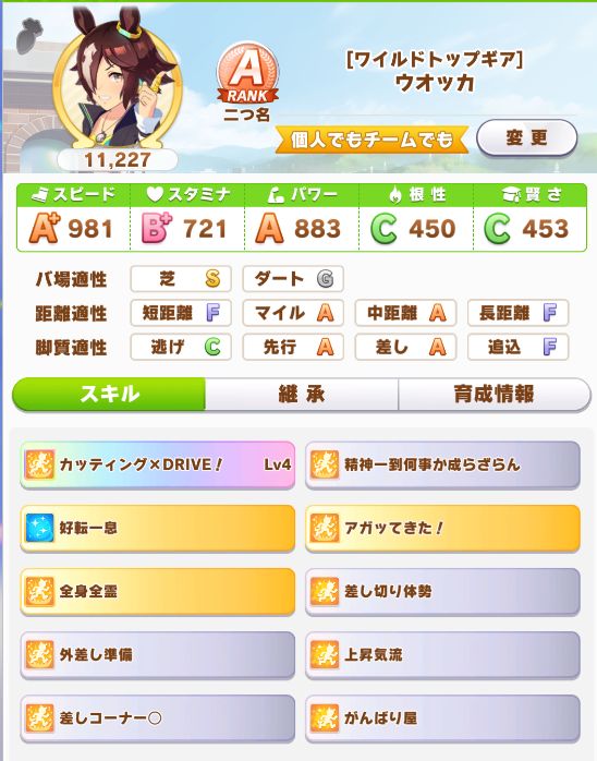 終了時点の評価点は7572だったので、逃げコツと橙スキルを取って何とかオープンリーグ用に。