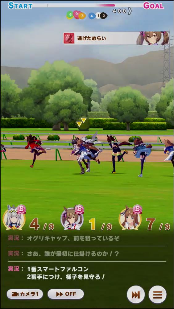 参加ウマ娘は、逃げ2(ファルコ)先行3(エル、ブライアン)差し4(グラス、キング、ウオッカ)