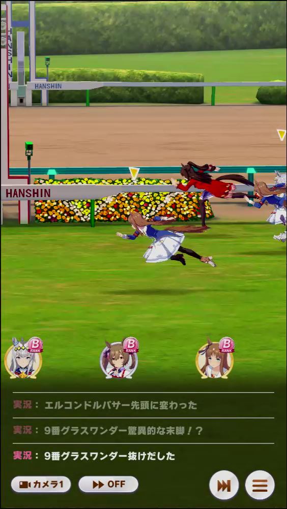 相手のファルコがウチのファルコをやっと追い抜き、その隣にオグリ、グラスが横一列にやっと抜け出す中、エルが逃げ切りを図る。