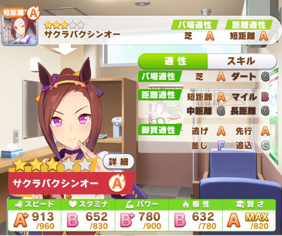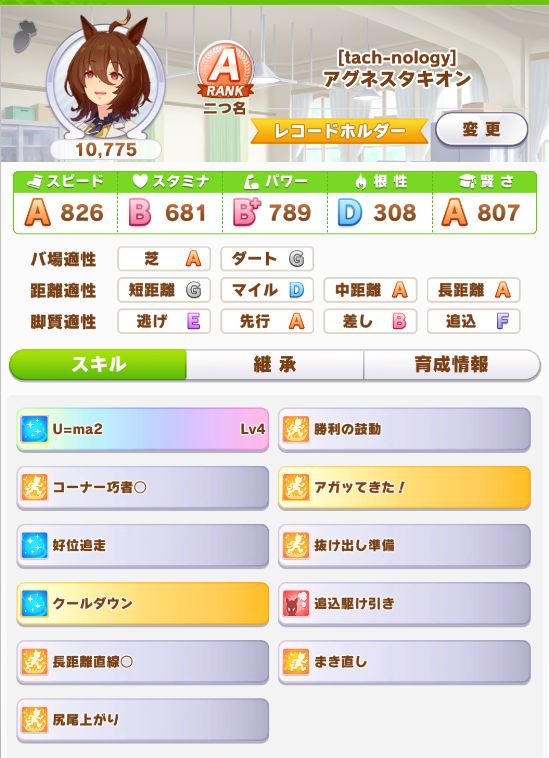 スピード500スタミナ300直線回復しか無いにも関わらず菊花賞は勝つ。適性をAにしたのが良かったのか?