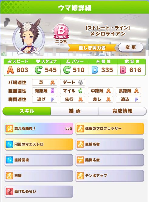 先行脚質でSP寄り育成でしたが序盤に位置取り系スキルが手に入らず、その為クラシックで思うように勝てず苦戦