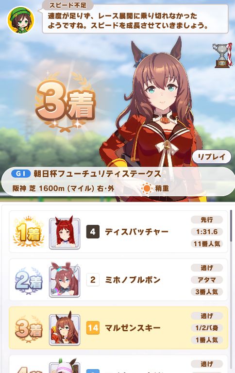 差し脚質で育成してみたけど…どうにもステータスが思うように上がらず、レースでもパワーが足りず準決勝まで