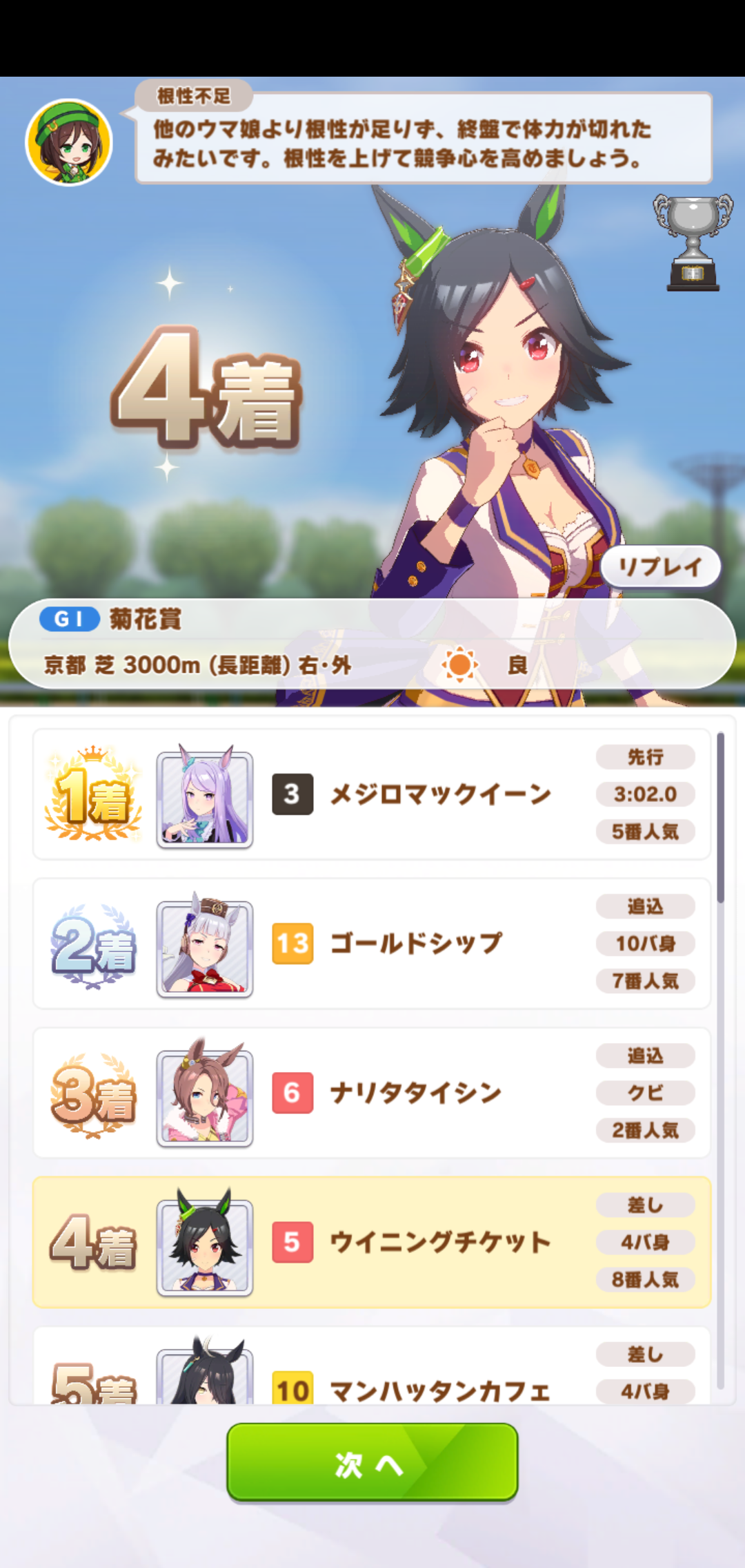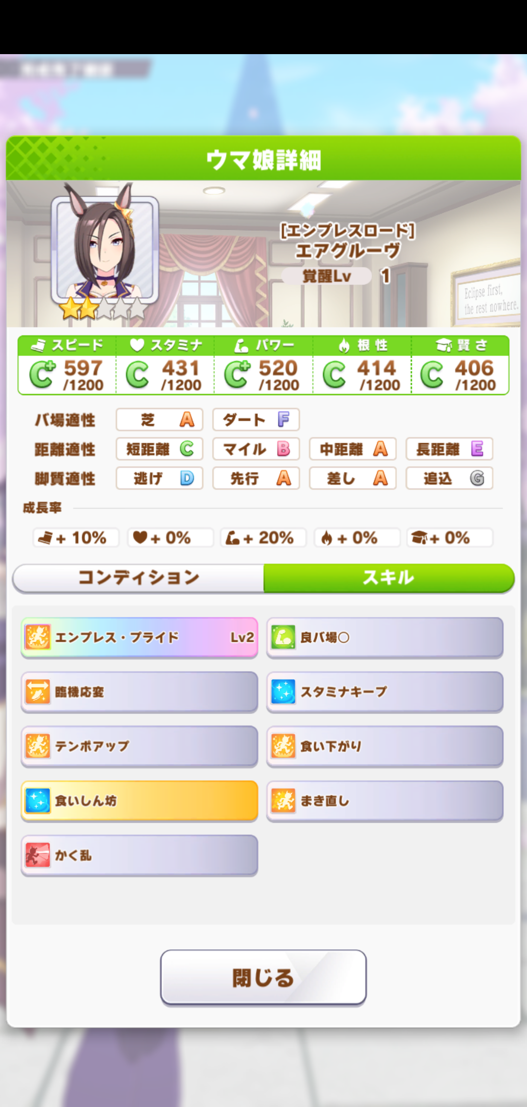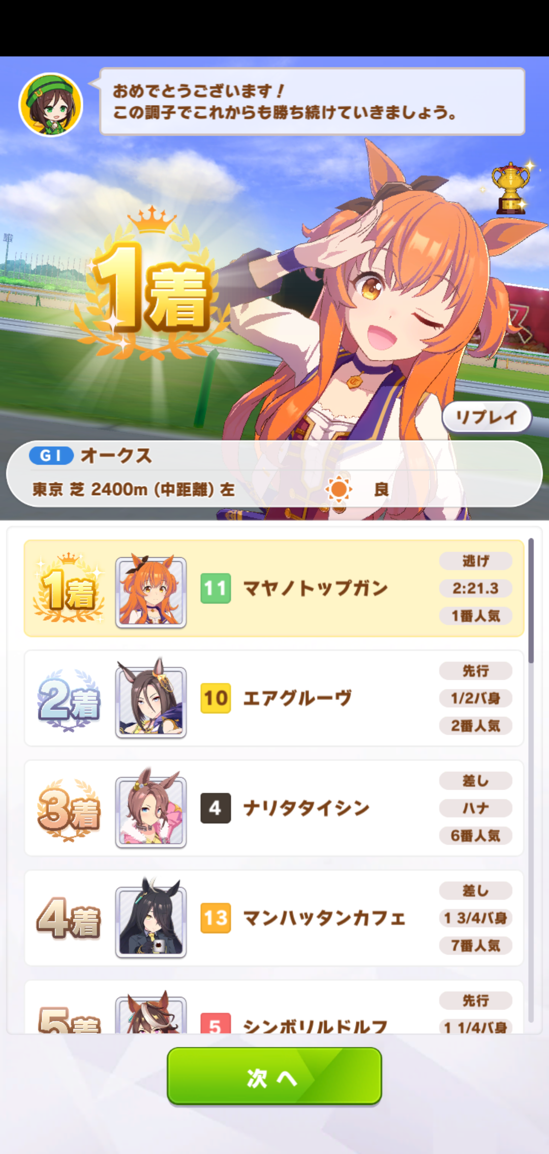 序盤はスキルが出なくて苦戦してたが、シニア級から連勝を続けて宝塚、秋天を無事勝って育成目標達成!