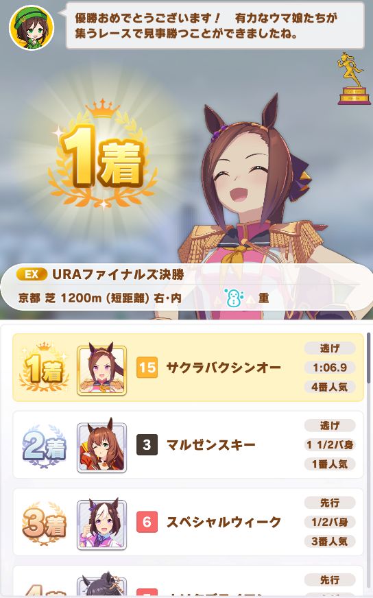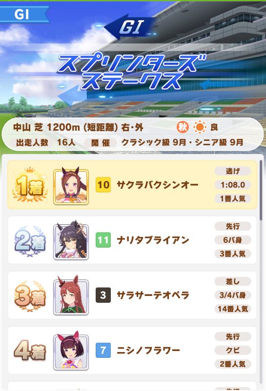 スプリンターズステークスで1コンするわ4%で失敗するわでしたが何とか育成完了