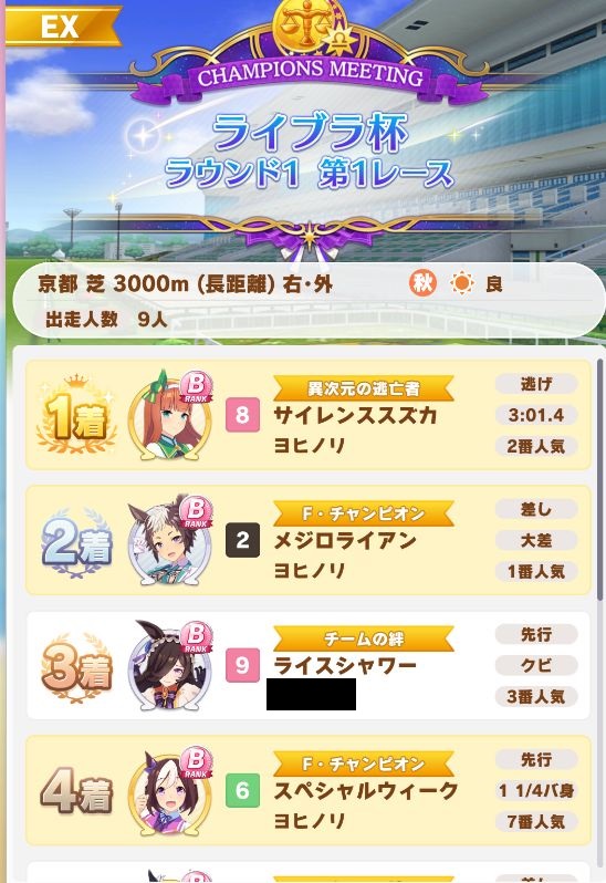 スペはレア回復が両方とも出ずにスタミナ切れで下がっていたスズカを抜くのに手間取ってしまい、固有が発動したものの5着