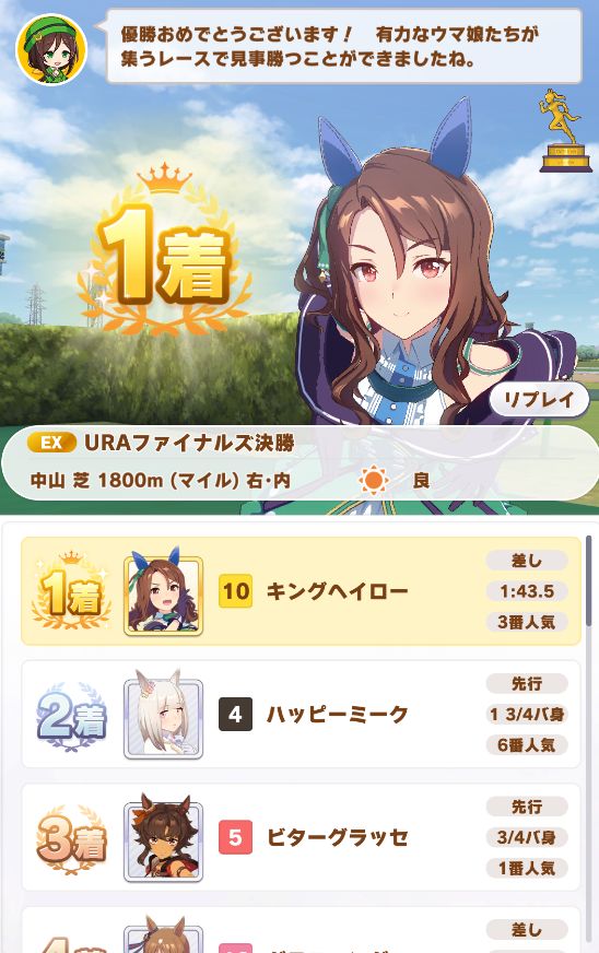アオハル杯は今回も優勝出来て、URAの決勝も今回はビターとリトルの2人を抑え無事ノーコンクリア。