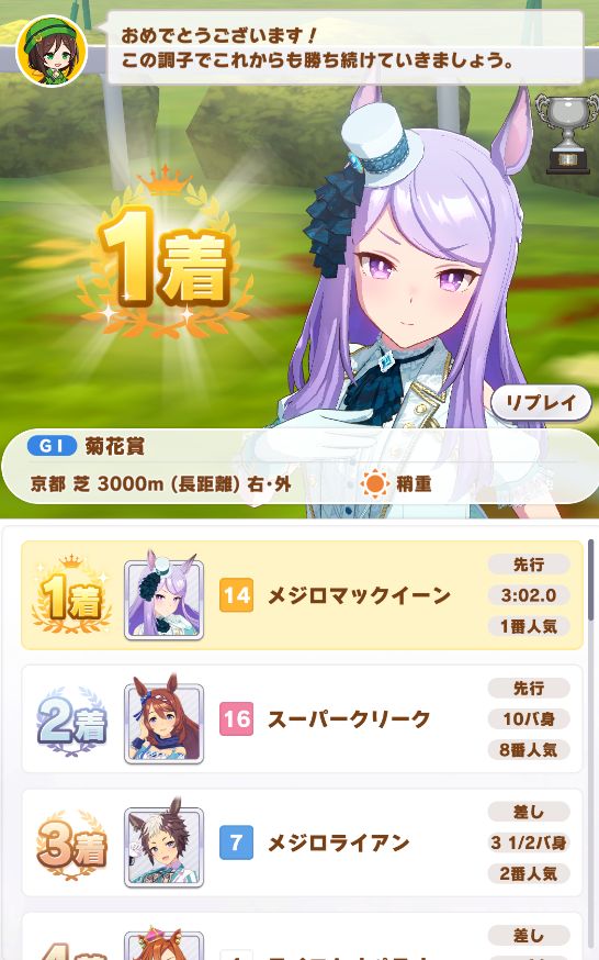 ステータスは下げたくなかったので、トレーニングメインで菊花賞は無事勝ち。
