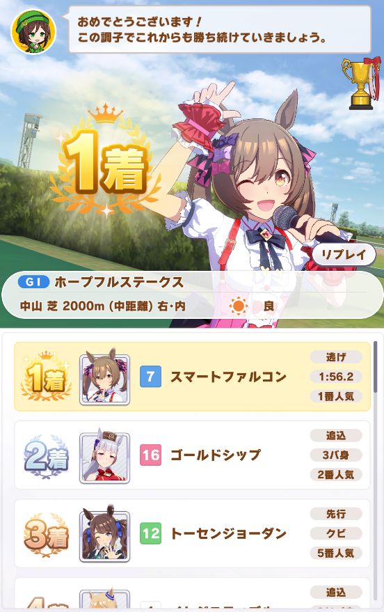 ついでに出たジャパンカップは内枠で先行脚質が多かったので逃げたら初めて固有スキルが発動したもののルドルフに差し切られて2着
