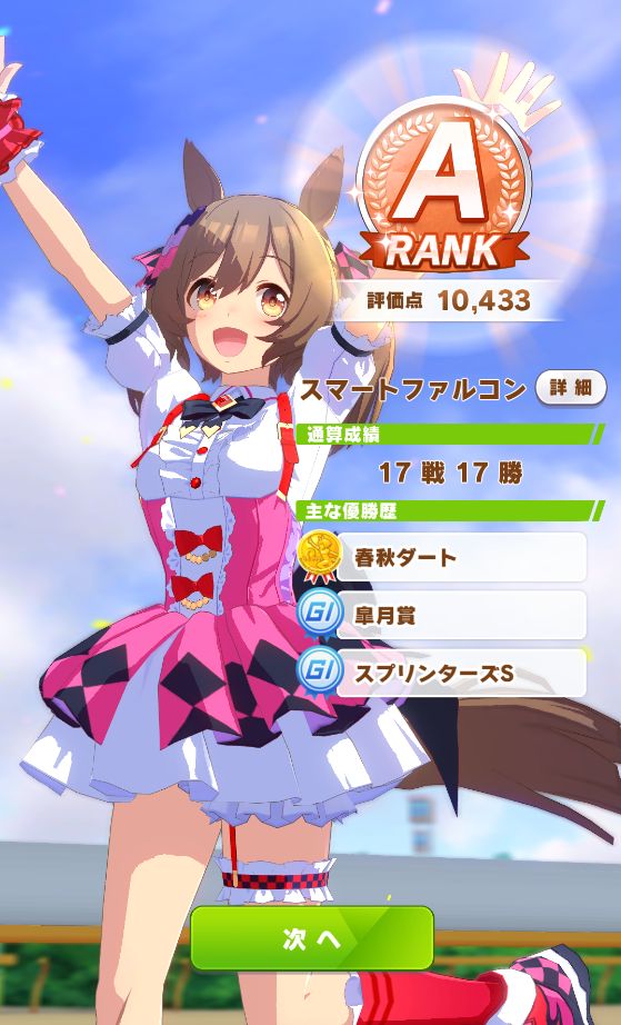 金スキルよりはノーマルでも中盤で出るスキルをコツコツ取りつつ無事有マも勝利。