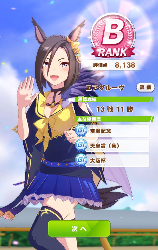終了時点で評価点7509。そこで抜け出し系、末脚、それとウインディちゃんがくれた逃げためらいデバフを付けてBランクに収める。