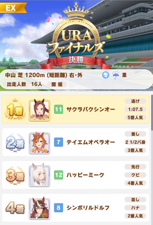 URAは差しで行き、決勝戦のみ先行・差しが固まった状態だったので逃げで行ってノーコンクリア