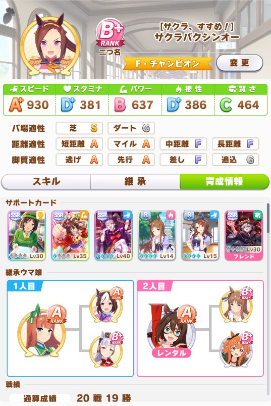 スピードが上振れて、因子もSP5根2URA2地固め2と良い感じで