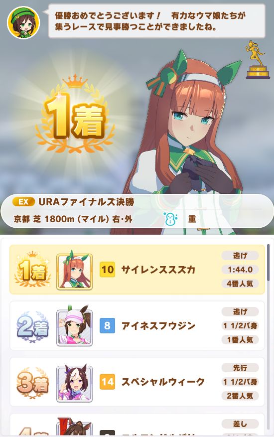 URA決勝でその弱点がモロに出てしまった為4度走って全く勝てず終了…