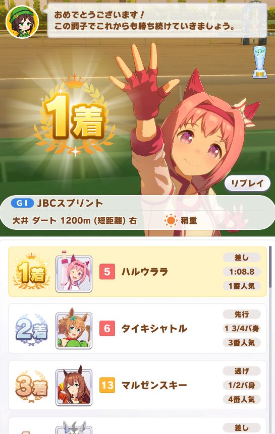 ダート短距離で差し脚質は難易度高いのですが、幸いパワーを優先的に上げたおかげで勝てた印象。