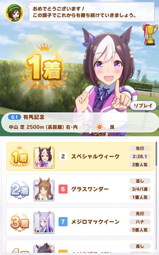 もしマエストロが出ていたら、恐らくゴルシのロングスパートを持ってしても、スペちゃんの全身全霊に屈していたものと思われます。