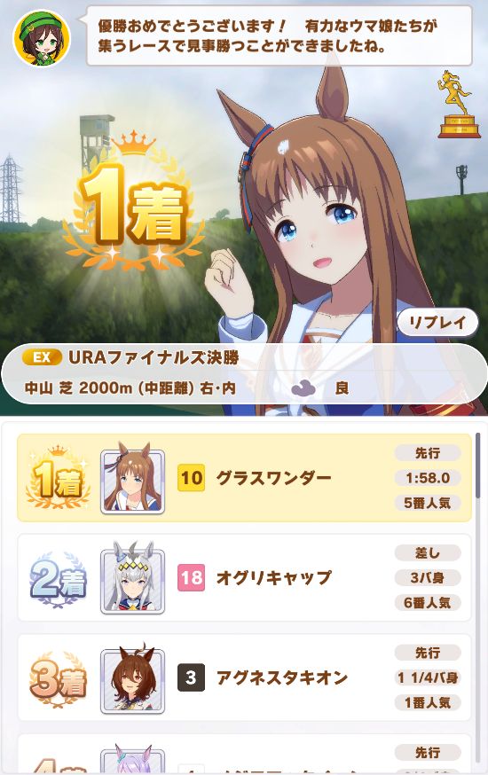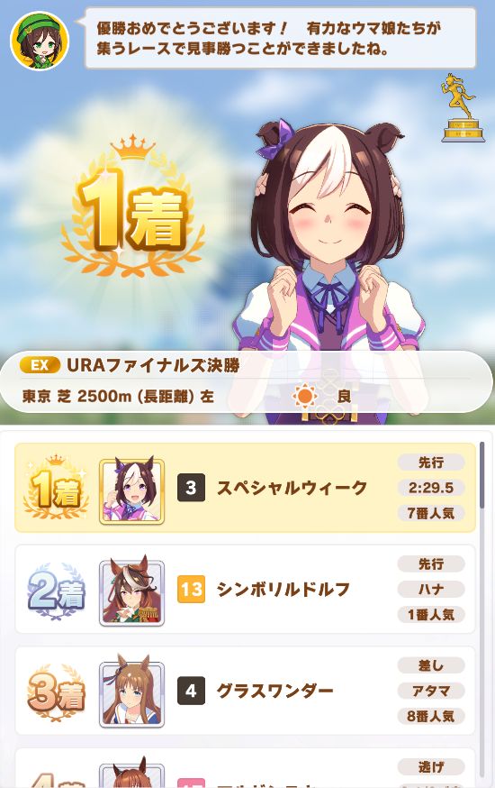 URAは準決勝で先行・差しが固まった状態で差し脚質で行ったら見事に抜け出し遅く2コン。