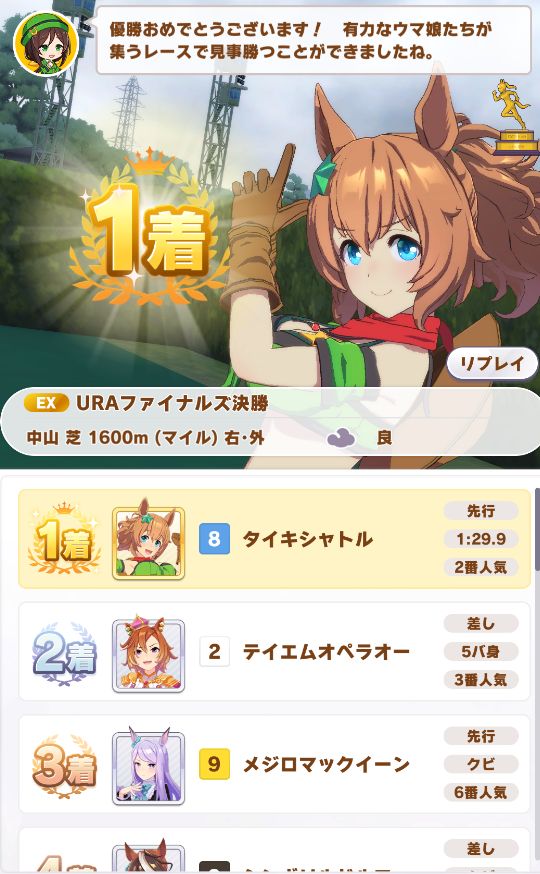 相手のネイチャ(1番人気)は定番のデバフかと思いきや、普通に勝つ用のスキルを持った娘だったのも助かった。もしデバフモリモリの娘が複数人いたら流石に無理だったと思う。