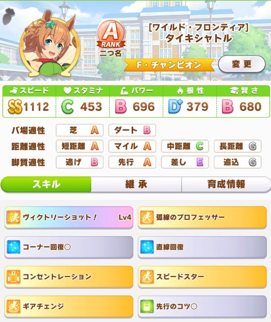 ということで、レア回復スキルに加えて因子に使ってたタキオンの固有スキルも獲って