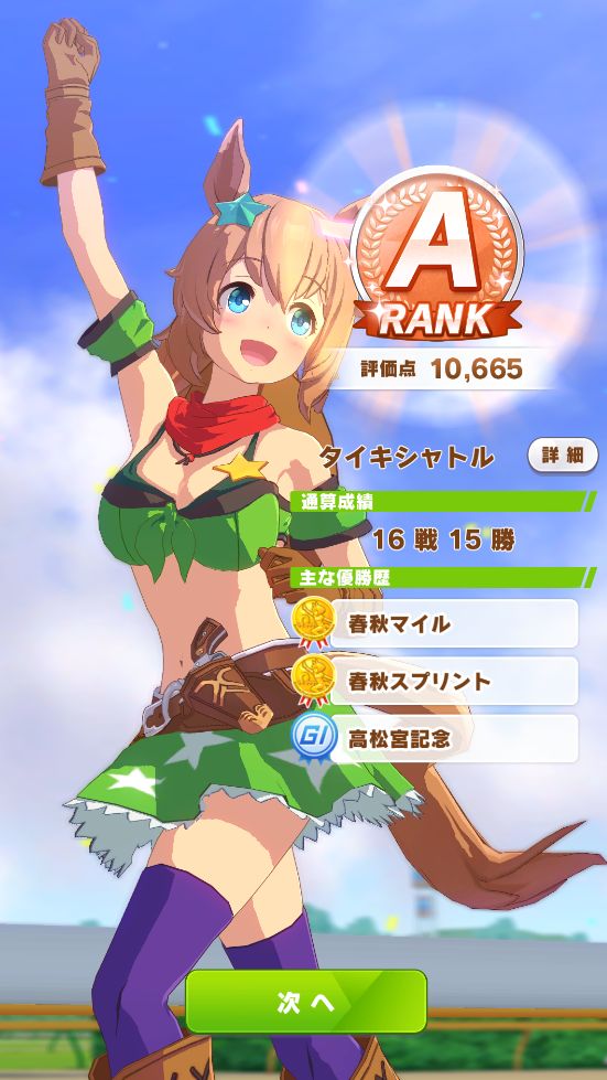 この時点でスタミナが700を超えだして、そろそろステータスを抑えて育成しないとマズイ状態だったので、極端な上振れせず助かった。
