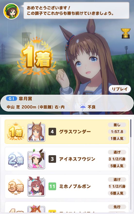 ゲート難のデバフスキルを狙う為クラシック級で宝塚に出走。内枠ながら無事勝利。